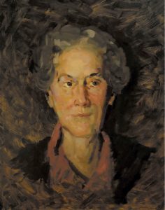 Unframed acrylic portrait of Grace Atwood Millett (1889-1971). At least one other portrait of Grace exists. She was the mother of Westford artist, William Atwood Millett (1922-2007), who often signed his work as WM or Millet. Grace lived in Westford throughout her life, and was married to Nathan Millett (1871-1955). Grace was also a nurse in town, practicing from 1912 to the 1950s.