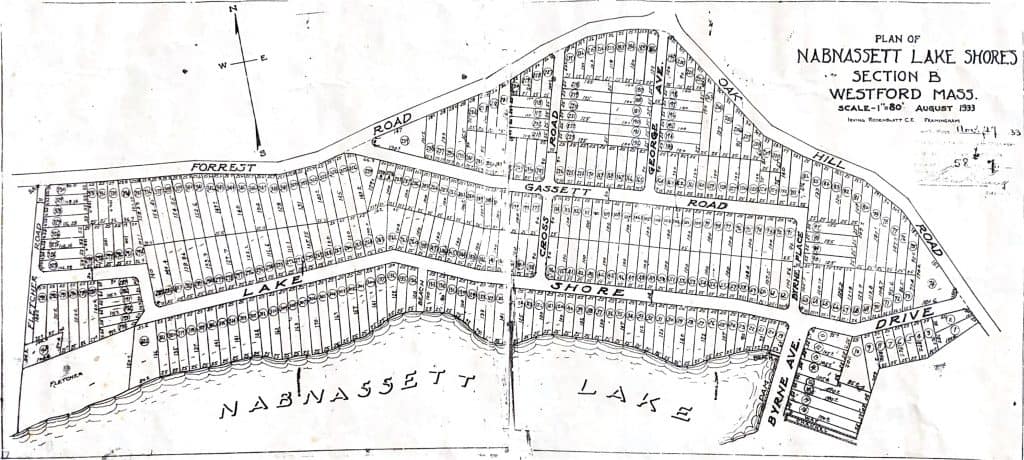 1933 plan for the northern side of today’s Nabnassett in Westford. The area was then described as “Nabnassett Lake Shores, Section B.” The planned layout was very close to how the roads are today, with minor alterations noticeable at the ends of George Ave and Fletcher Rd (Fletcher Ln today). It was drawn by K. Robes. The Nabnassett Lake area was originally a summer community, but had year-round residents by the 1960s, if not earlier.
