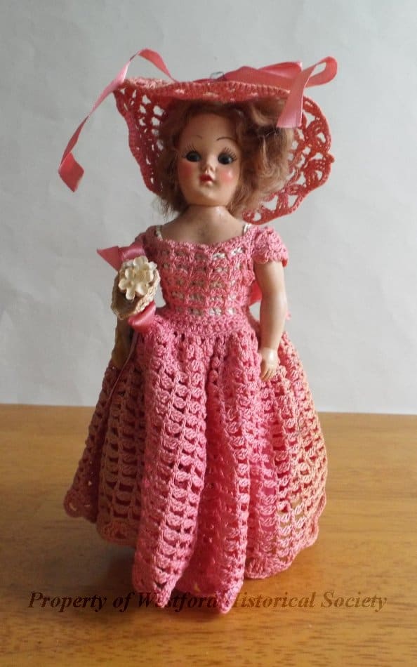It was owned by Marie Aurea (Marcotte) Rondeau (1934-2015). She was a lifelong Westford resident, living on Pleasant St for most of her life. Some of her Westford Academy notes are highlighted here. In her WA yearbook, she stated her ambition was to become a nurse. She specifically enjoyed crocheting and knitting, as the doll’s pink petticoat appears hand-made. Later in life, she served on the Board of Directors of the Cameron Senior Center.